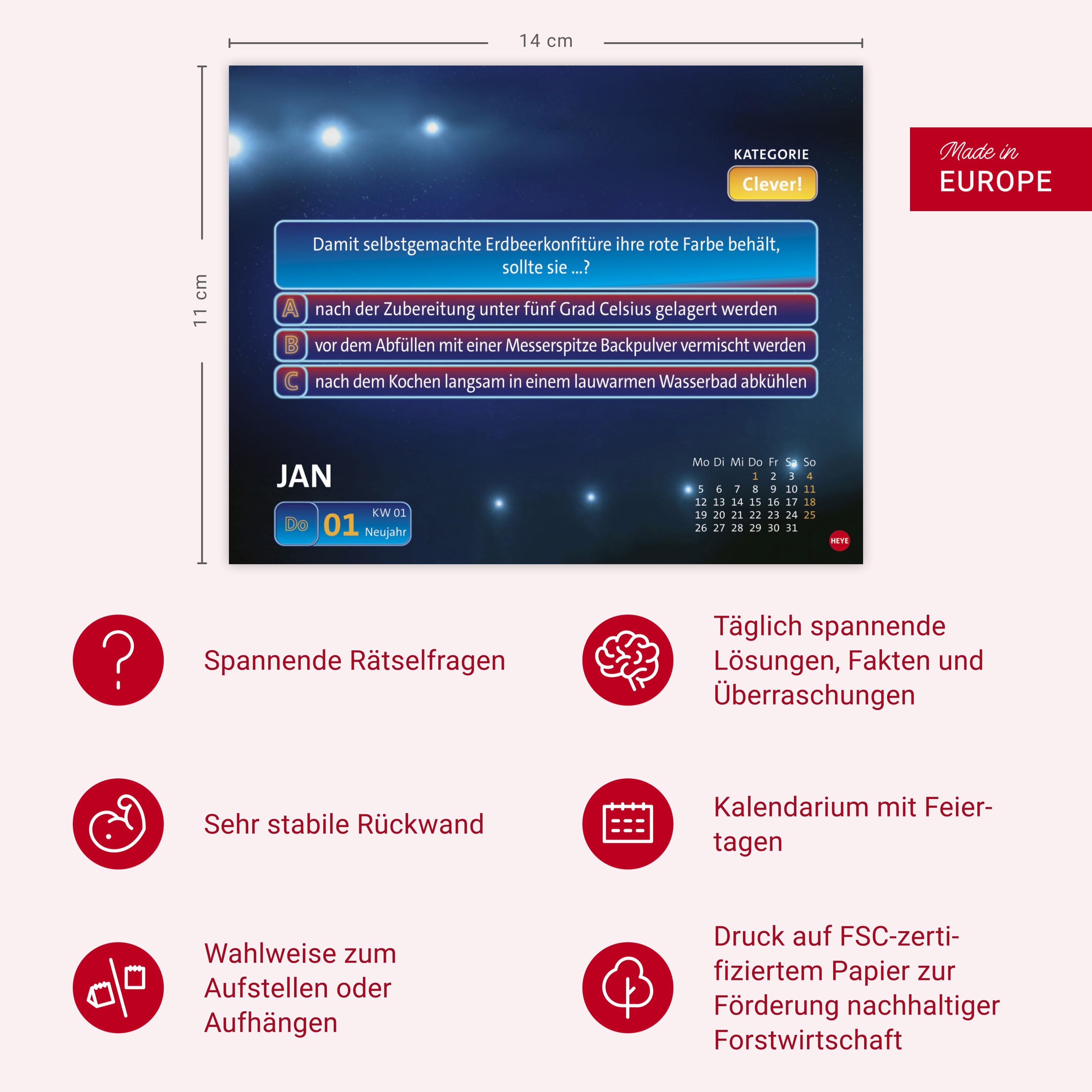 Ob in der Küche oder im Büro, der handliche Kalender im Querformat 14 x 11 cm findet überall Platz. Sie können ihn flexibel als Tischkalender aufstellen oder als Abreißkalender an der Wand befestigen. Jeder Wochentag hat ein eigenes Blatt, während Samstag und Sonntag sich eine Seite teilen. Ein Bestseller aus dem Athesia Kalenderverlag, der das Original-Gefühl der erfolgreichen Wissensshow direkt zu Ihnen nach Hause bringt.